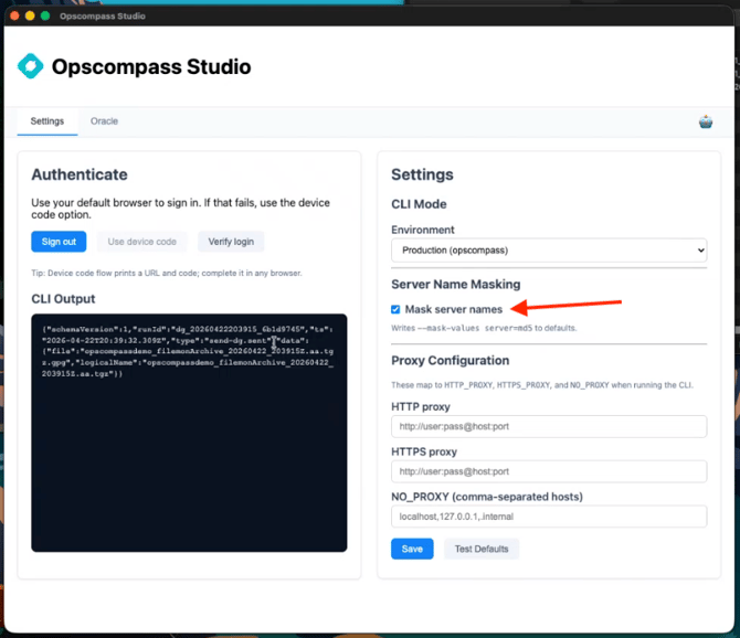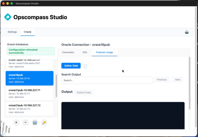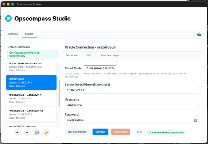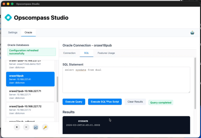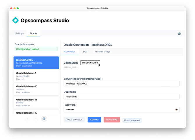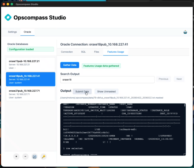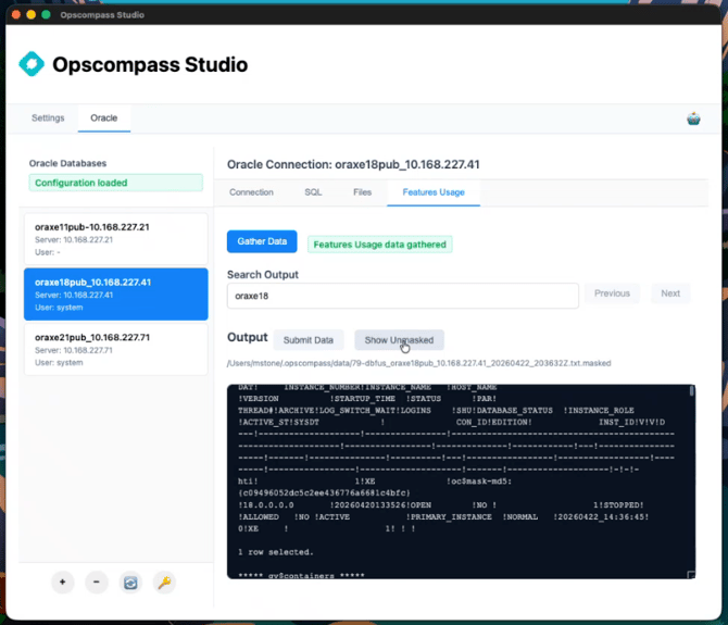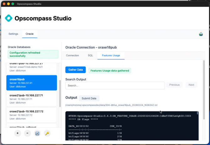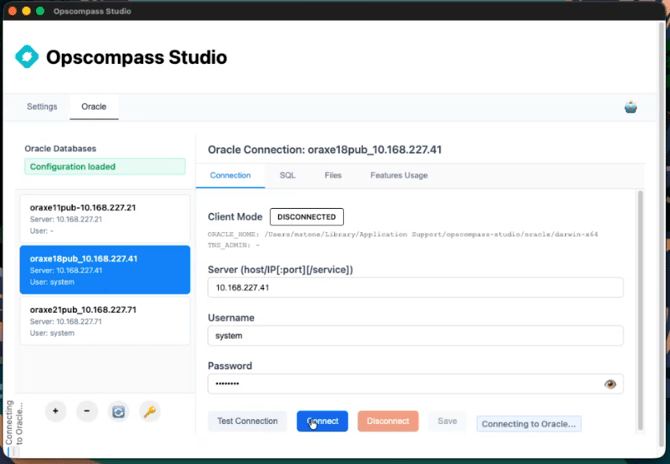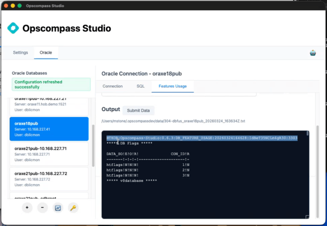 Opscompass Studio is a desktop application used to connect securely to Oracle databases and collect feature‑usage data for Oracle licensing analysis. Studio bundles all required dependencies, including the Opscompass CLI and Oracle Instant Client, so no separate installations or administrator privileges are required.