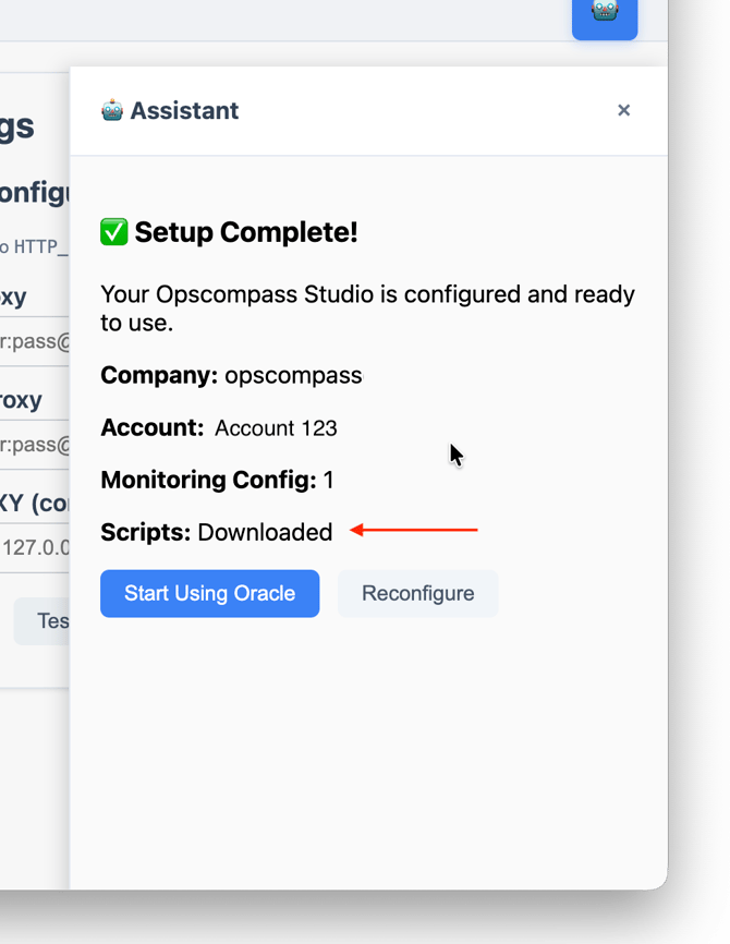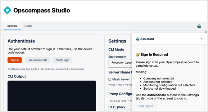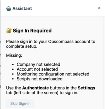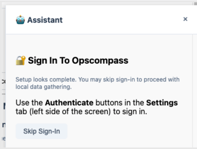 In such cases, if the login to Opscompass is no longer valid, but the configuration is otherwise complete, then you will see the option above to skip sign-in.
