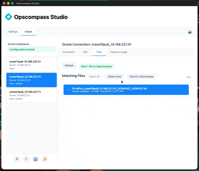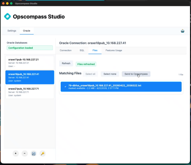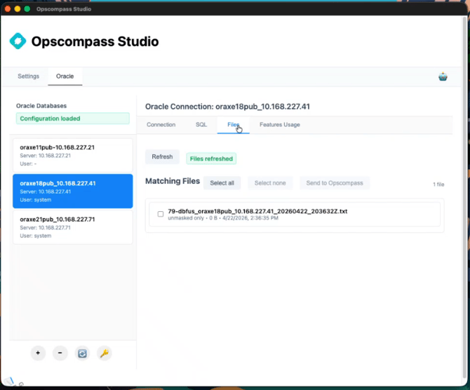 The Files tab provides visibility into Oracle feature usage files that have been generated locally by Opscompass Studio and allows you to manually submit files that were not previously sent to Opscompass.